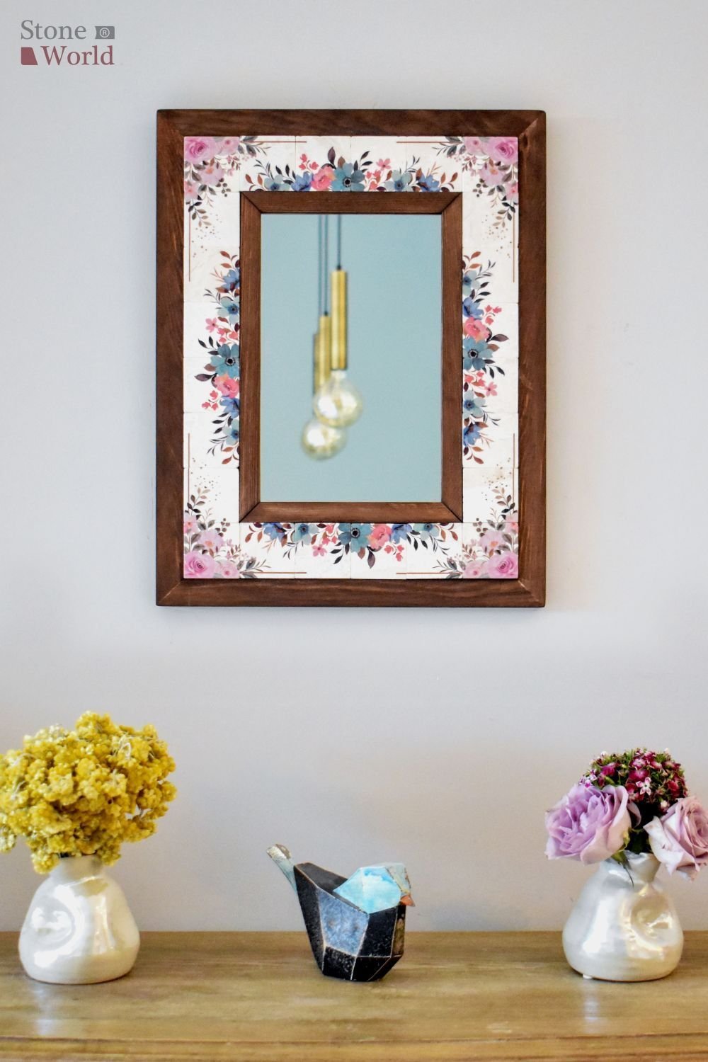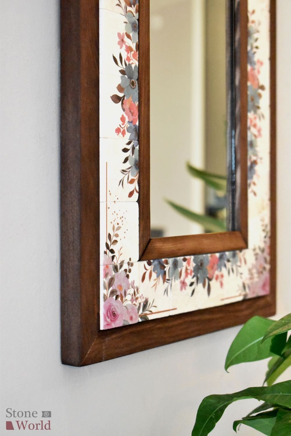 Çiçek Temalı, Masif Ahşap Ve Desenli Mermerden Dekoratif Ayna - 34x44cm - 066.1