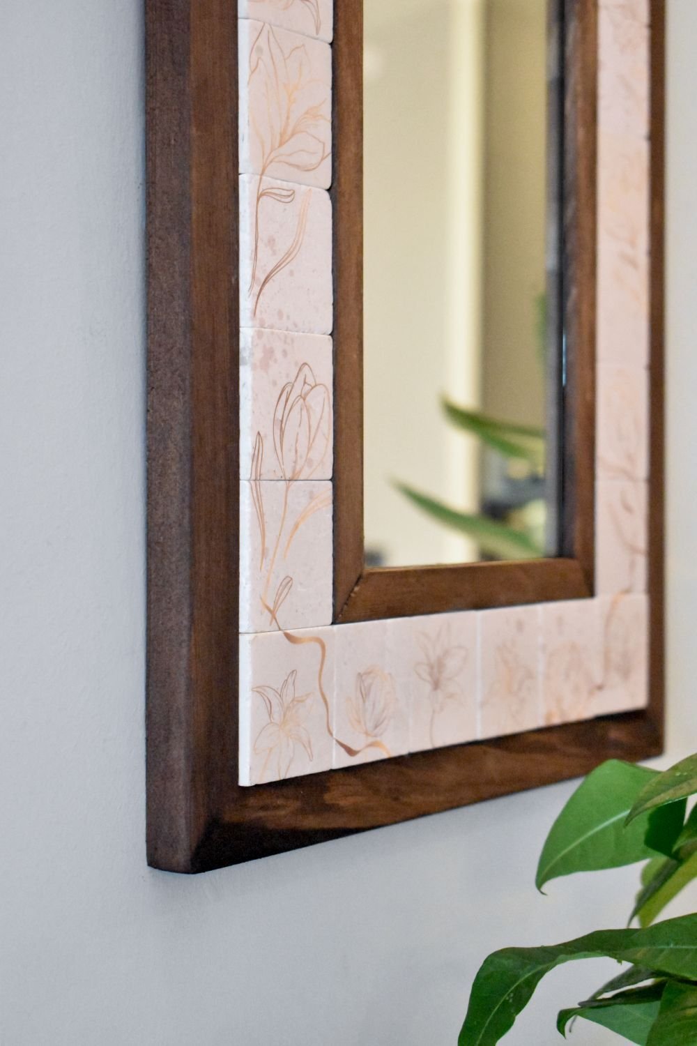 Çiçek Temalı, Masif Ahşap Ve Desenli Mermerden Dekoratif Ayna - 34x44cm - 067.1