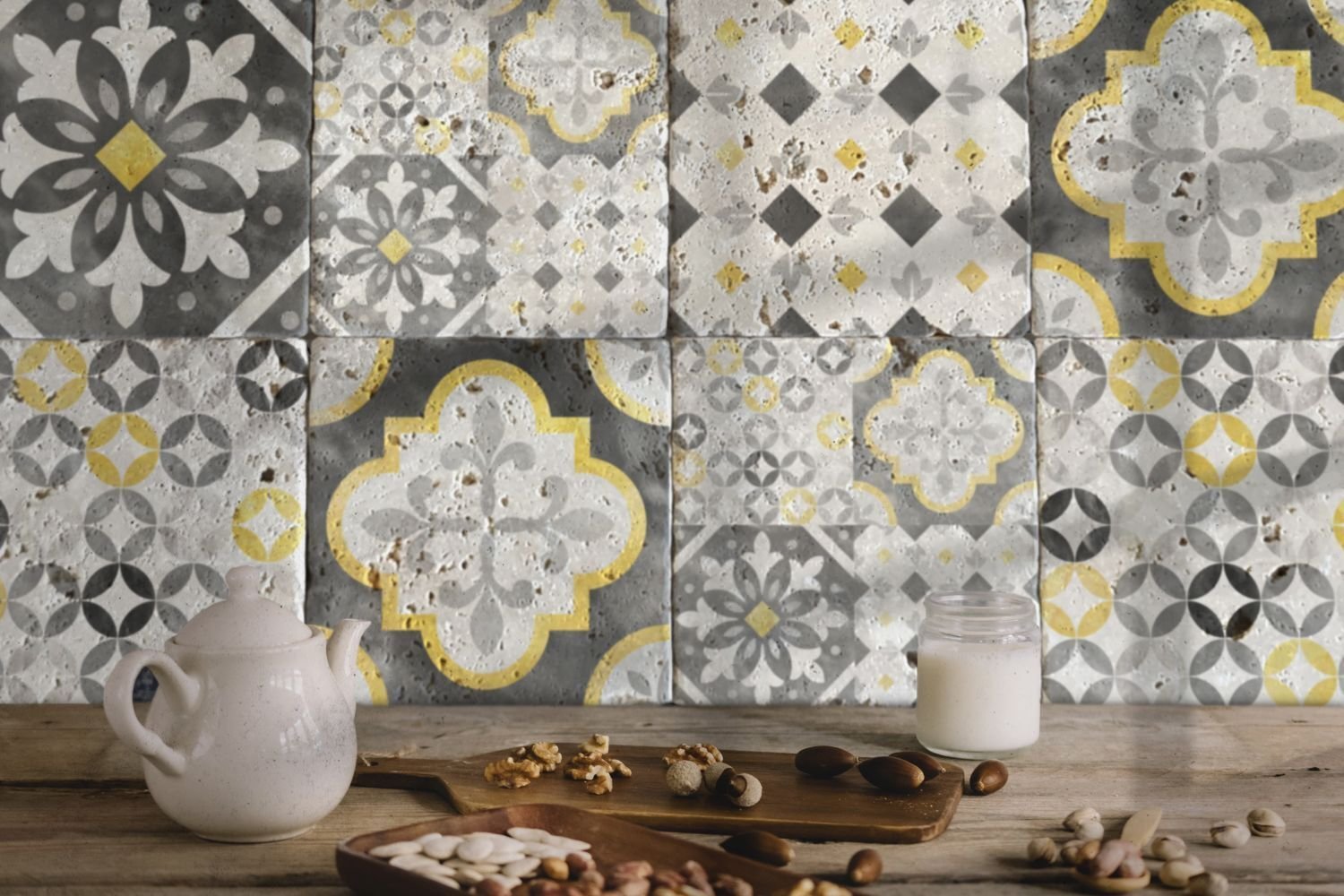 Taşın eskitilmiş dokusuna uyum sağlaması için bazı modellerde desenlere eskitme efektleri uygulanmıştır.