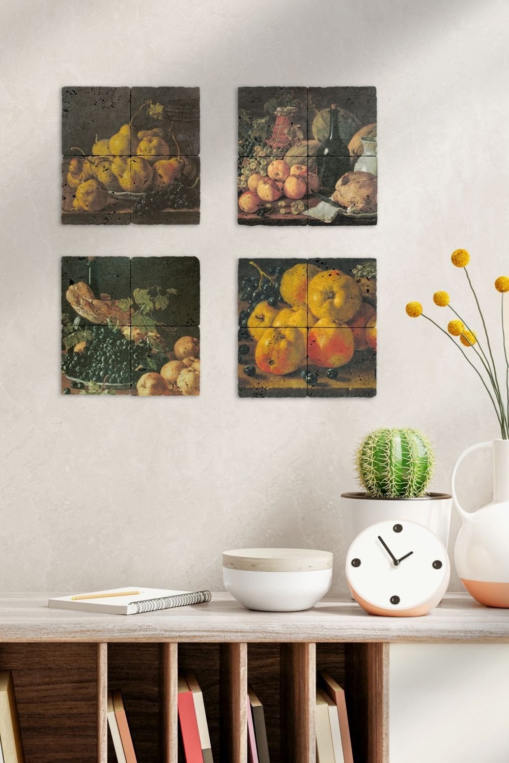 Duvar tabloları %100 doğal Traverten Taşından, el işçiliğiyle üretilmektedir. Eskitilmiş yüzeyi sayesinde her parça doğal taşın karakterini birebir yansıtır.
