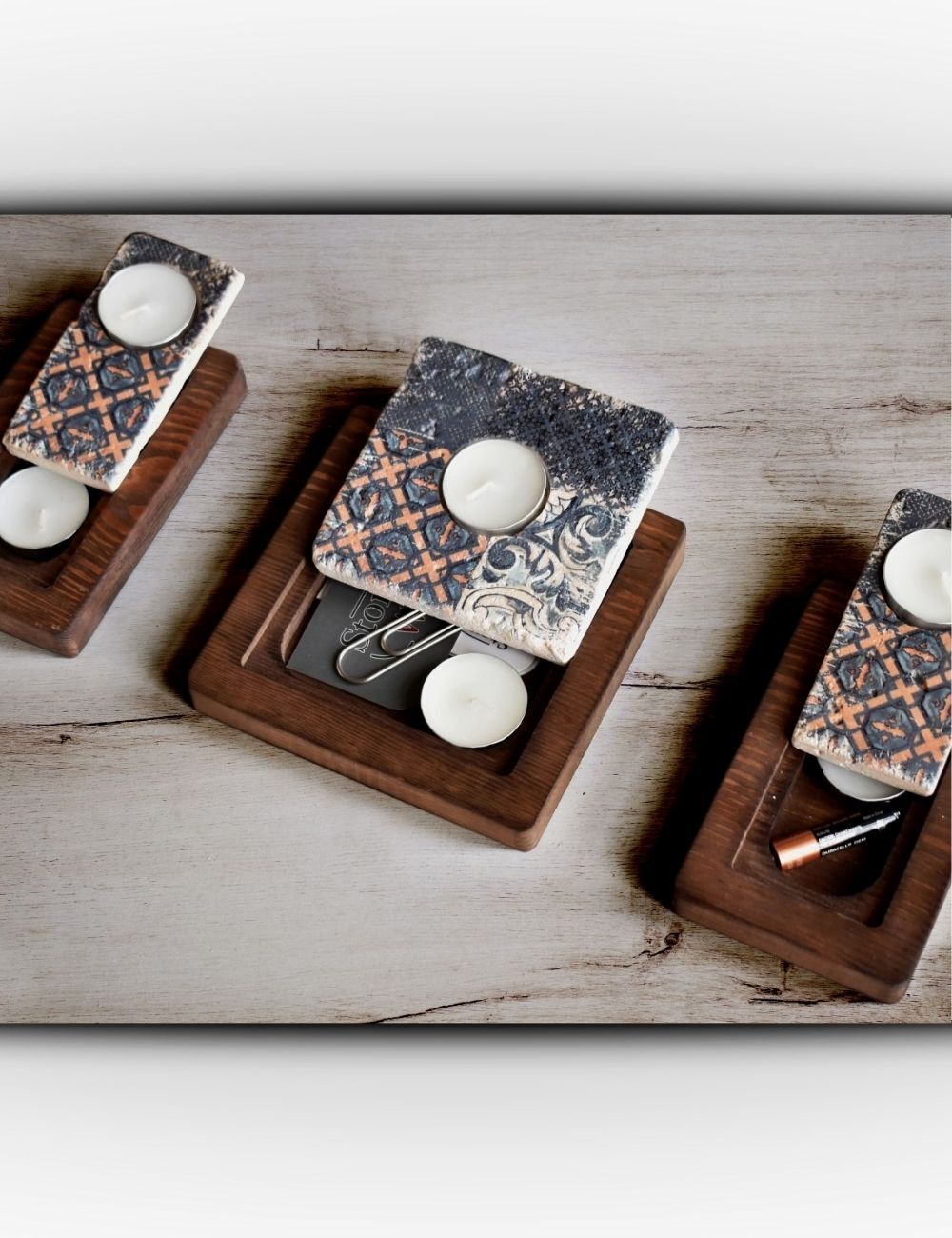 Ahşap altlıklar yedek mum saklama alanı olarak veya çok amaçlı dekoratif kullanım için değerlendirilebilir.
