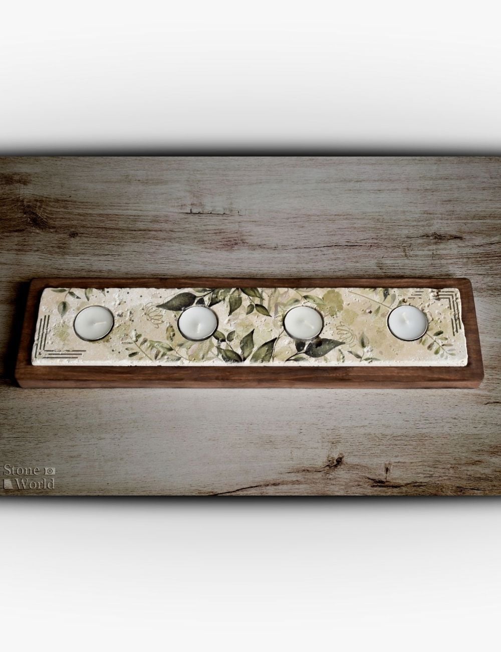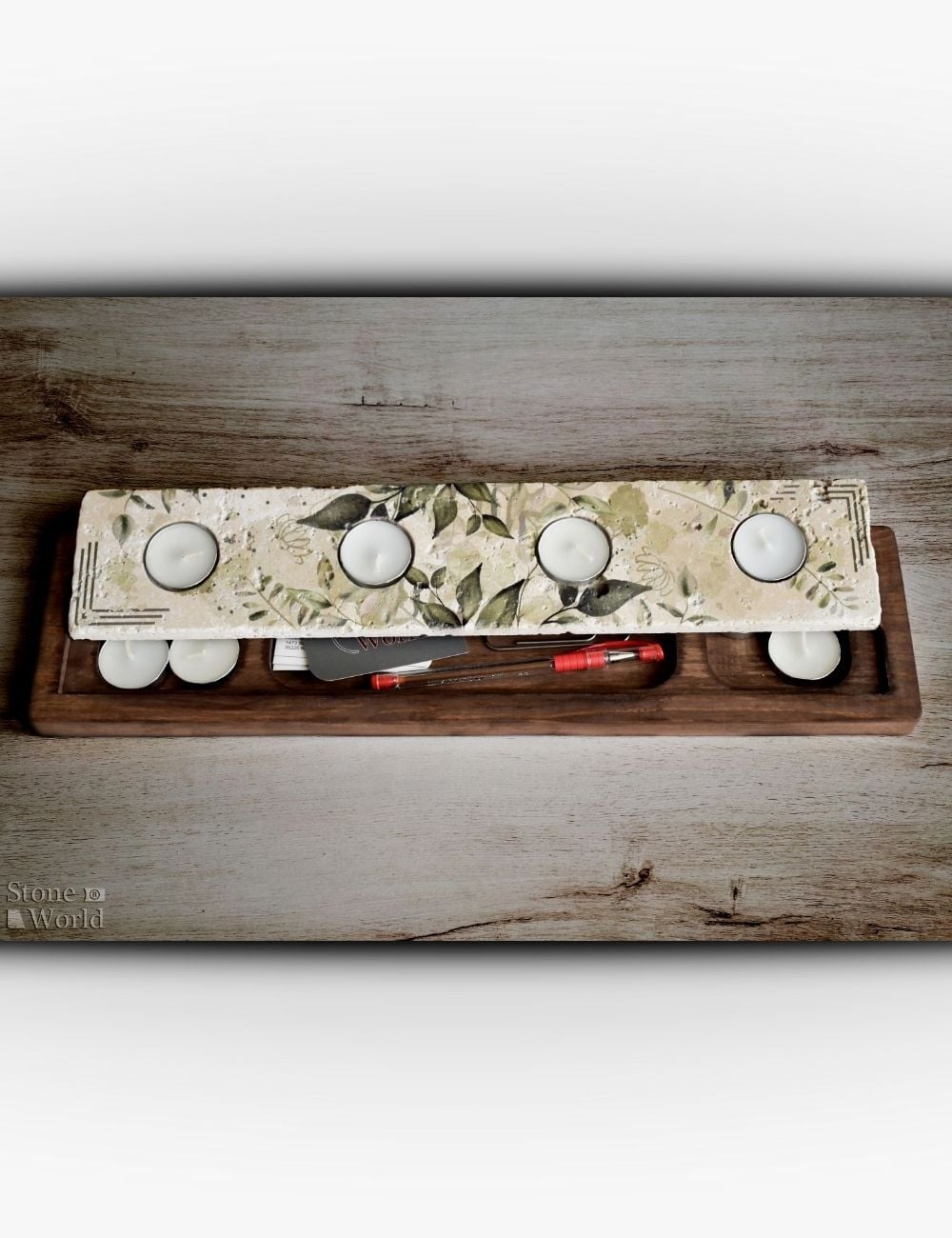 Bu mumluk takımı %100 doğal traverten taş ve fırınlanmış masif ahşap kullanılarak üretilmiştir. Doğal taşın karakteri ile ahşabın sıcak dokusu bir araya gelerek dengeli ve eşsiz bir tasarım sunar.