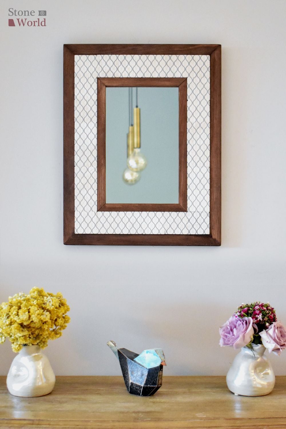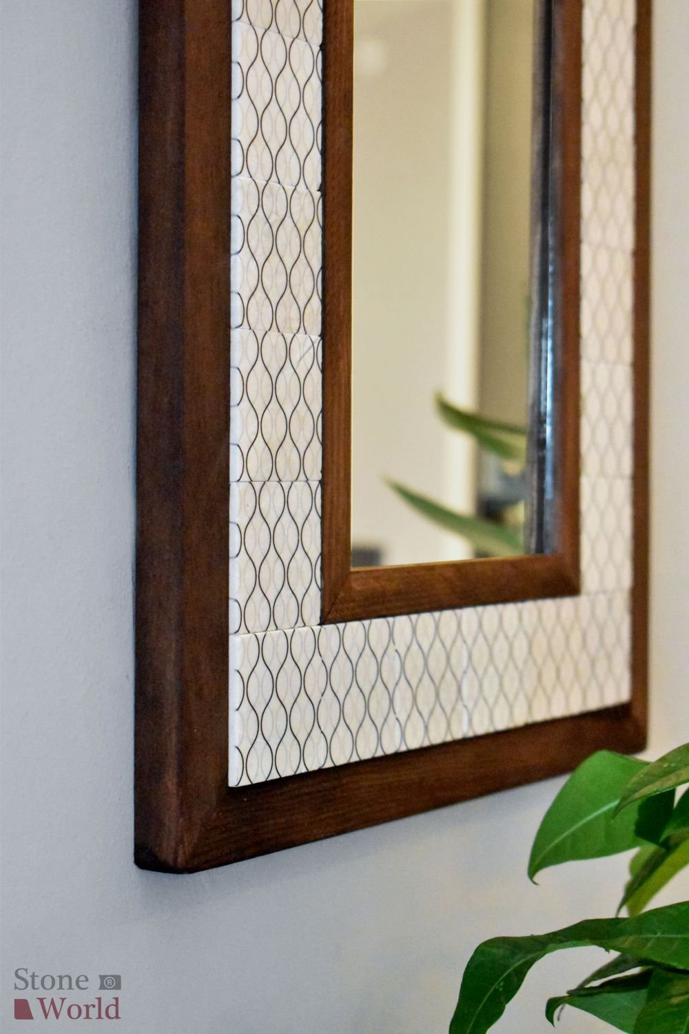 Geometrik Temalı, Masif Ahşap Ve Desenli Mermerden Dekoratif Ayna - 34x44cm - 007.1
