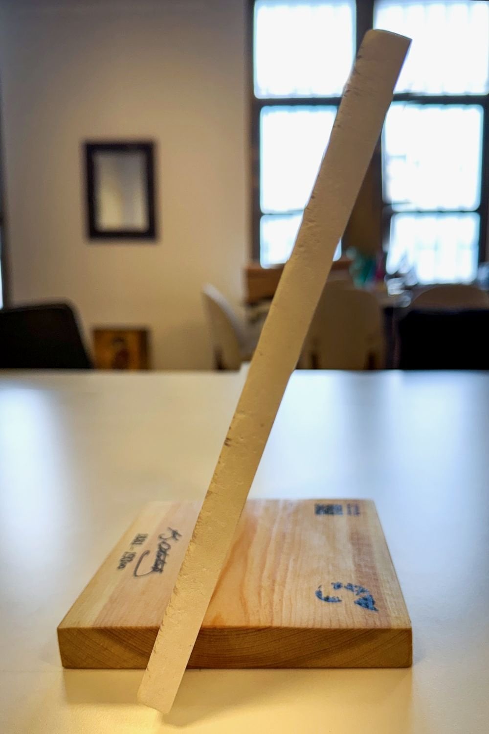 Bu tablo beyaz Limra Doğal Taşından üretilmiştir. Eskitilmiş yüzeyi sayesinde taşın doğal karakteri ön plana çıkar. Masif ahşap standı ile masaüstü, ofis ve çalışma alanlarında anlamlı ve güçlü bir dekoratif obje olarak konumlandırılabilir.