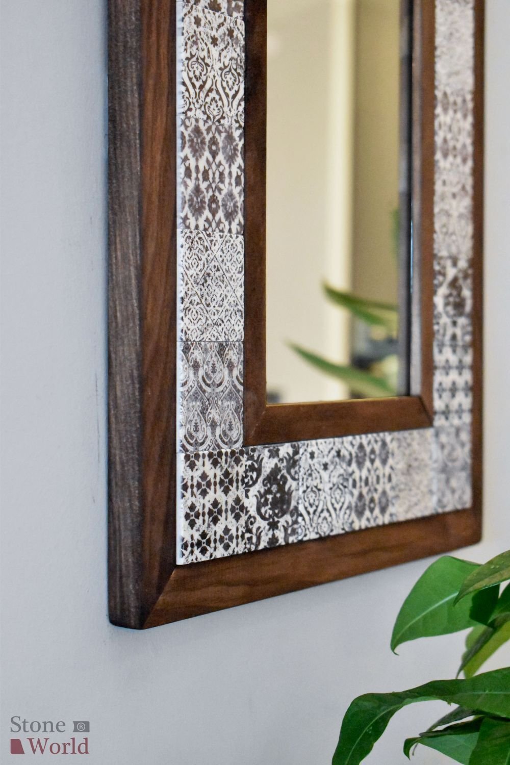 Patchwork Temalı, Masif Ahşap Ve Desenli Mermerden Dekoratif Ayna - 34x44cm - 003.1