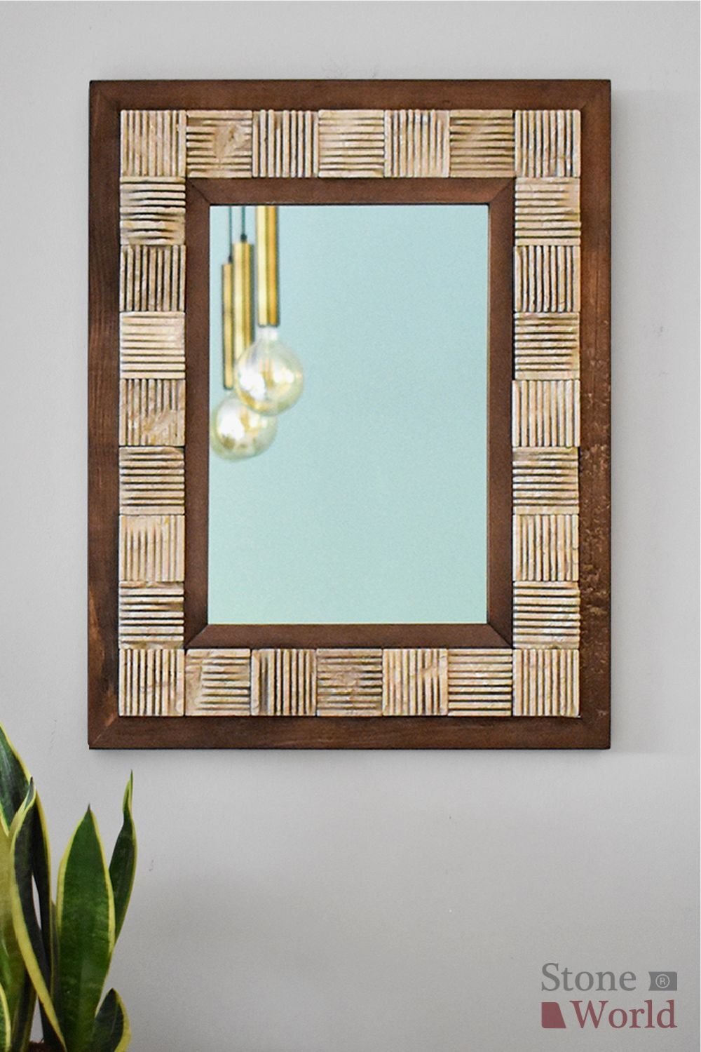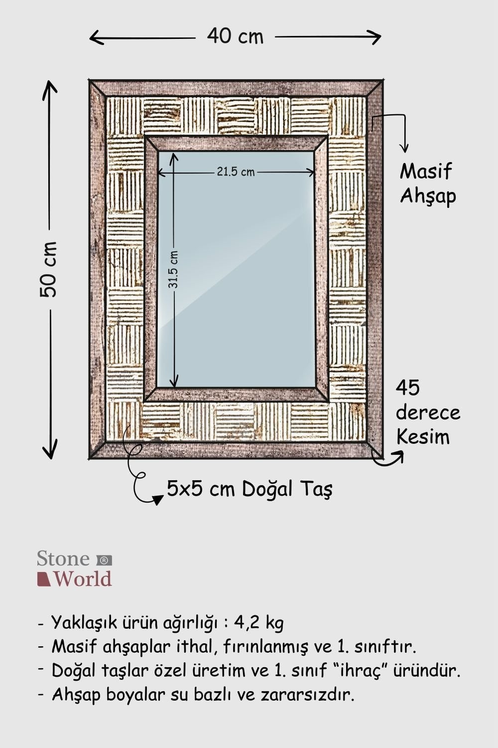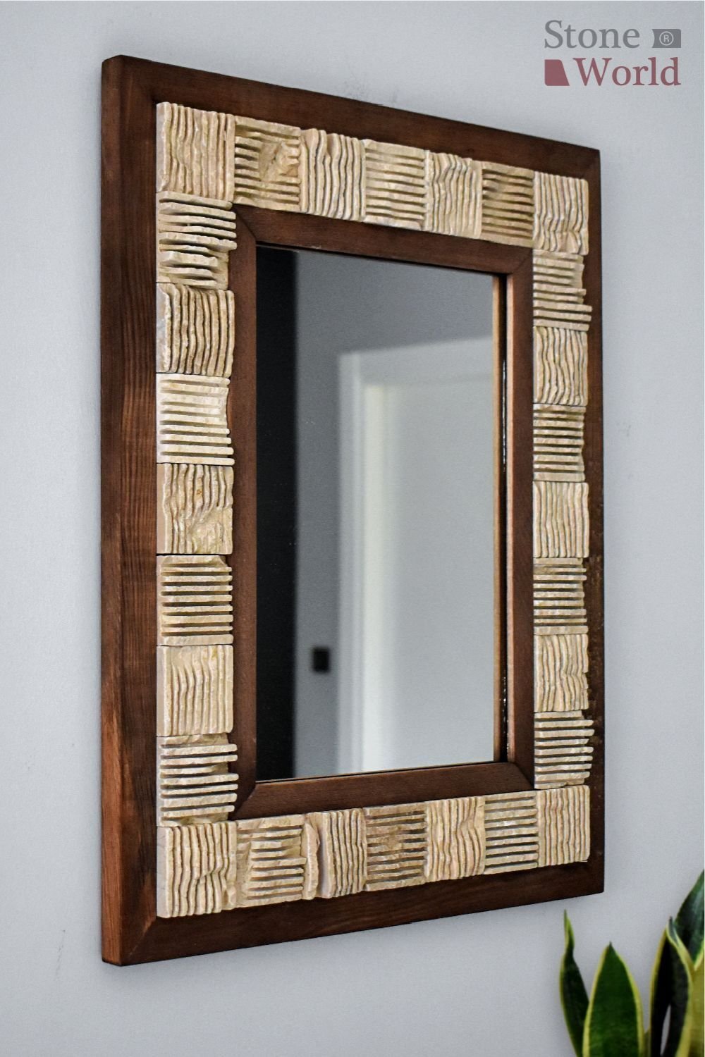 El yapımı bu duvar aynası, masif ahşap iskeleti ve Bej Mermer çerçevesiyle hem doğal hem de modern bir estetik sunar.