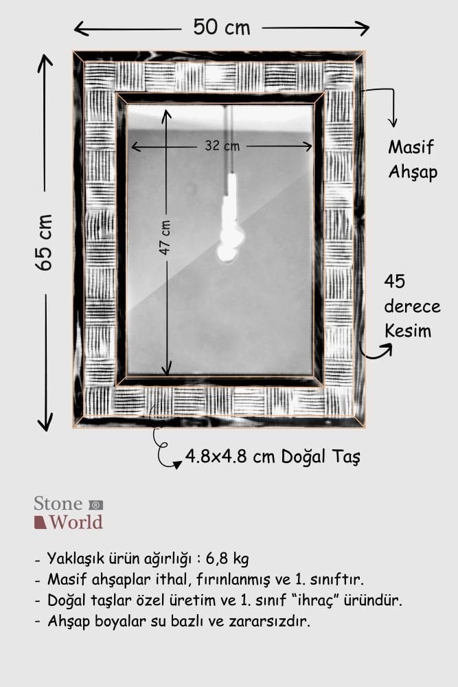 El yapımı bu duvar aynası, masif ahşap iskeleti ve Bej Mermer çerçevesiyle hem doğal hem de modern bir estetik sunar.