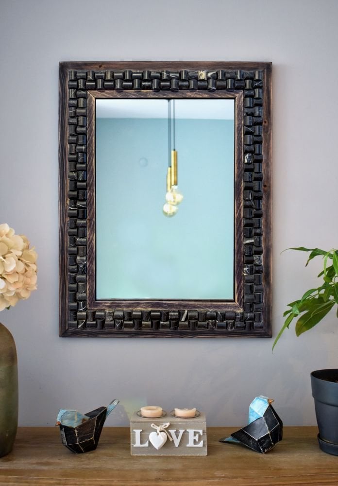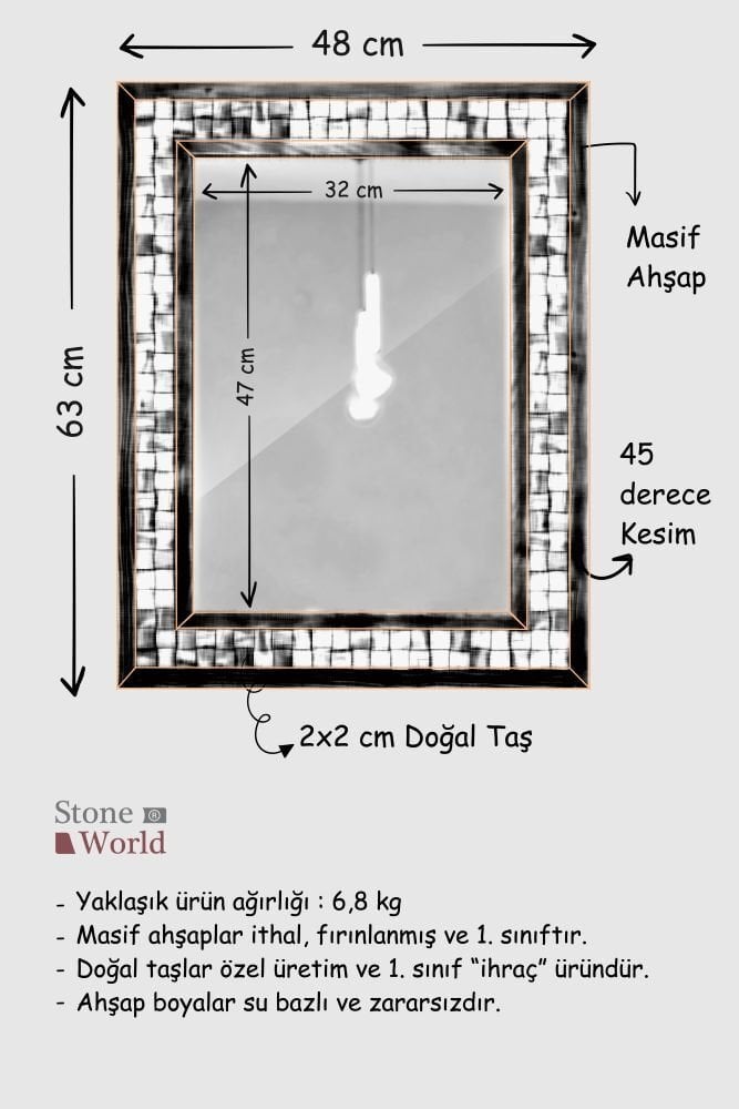 El yapımı bu duvar aynası, masif ahşap iskeleti ve Siyah Mermer çerçevesiyle hem doğal hem de modern bir estetik sunar.